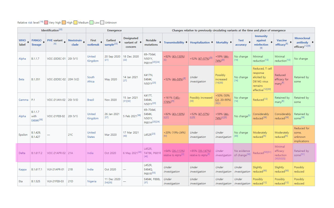 세계 보건기구(WHO)는 델타 변종을 VOC(Variants of concern)로 분류함